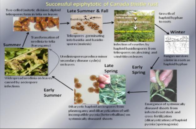 Naturalized thistle rust infections cause systemic disease in CT, which annually reduces the stem density of a thistle patch and eventually kills the entire thistle clone’s rhizome [3]. By 1893, thistle rust was proposed as a biological control agent for CT, but an incomplete understanding of the complex life cycle preventing reliable establishment of epiphytotics (outbreaks) of the disease persisted for another 120 years. Then Berner et al. [3] published the systemic disease cycle in 2013. This enabled fall harvesting of thistle rust teliospores as the biocontrol agent, with artificial transfer of the disease from a naturally occurring infection to the surface of thistle rosettes of a disease-free thistle clone. Under appropriate weather conditions the teliospores will germinate into basidiospores which then enter the rosette and produce a germ tube that grows down the stem into the root and finally into the thistle rhizome where it overwinters and becomes the initial disease infection.