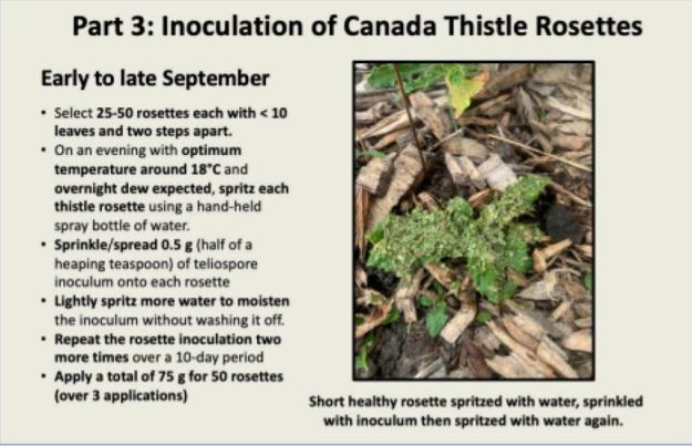 To improve on a general lack of naturally occurring thistle rosettes at fall inoculation sites, the sites can either be mowed to the ground or the thistle stems pulled four to six weeks prior to the planned inoculation date. This will prepare the site with a patch of new rosettes that will increase the likelihood of infection success.