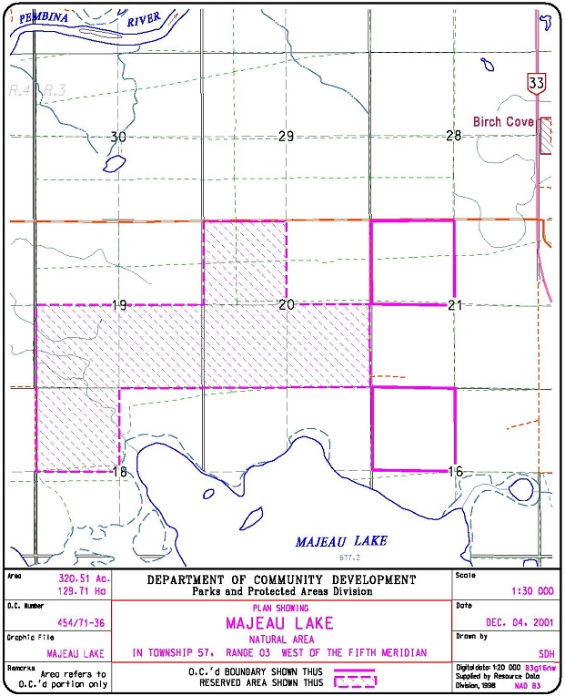 This Natural Area is composed of three distinct land parcels: one large PNT portion (six quarter-sections) and two smaller OC portions, each one quarter-section in size. All parcels are north of, but not on, Majeau Lake.